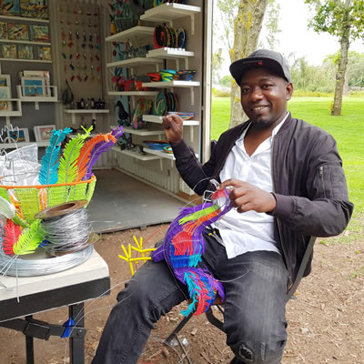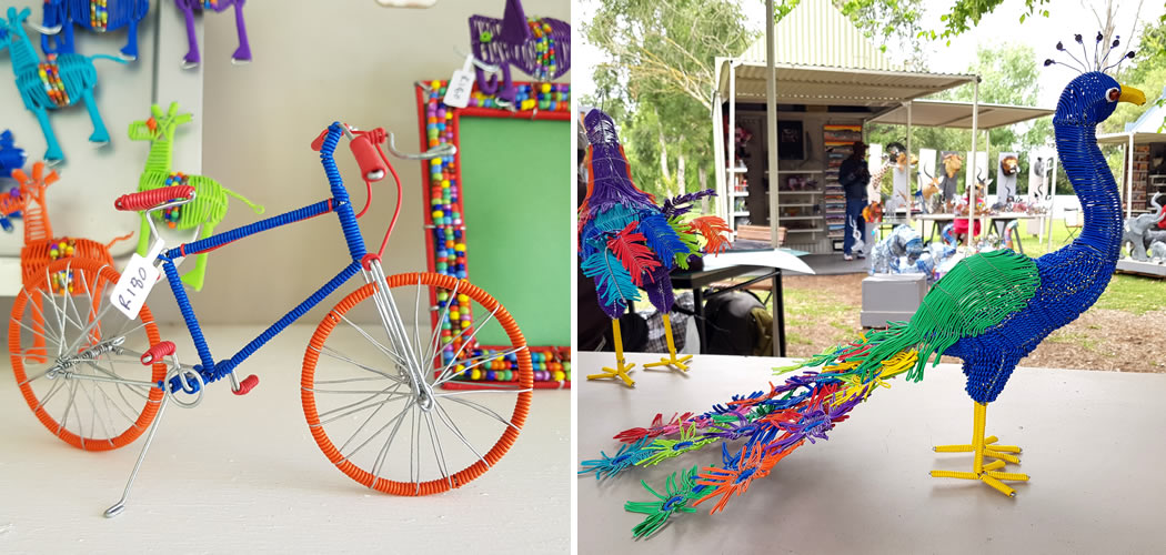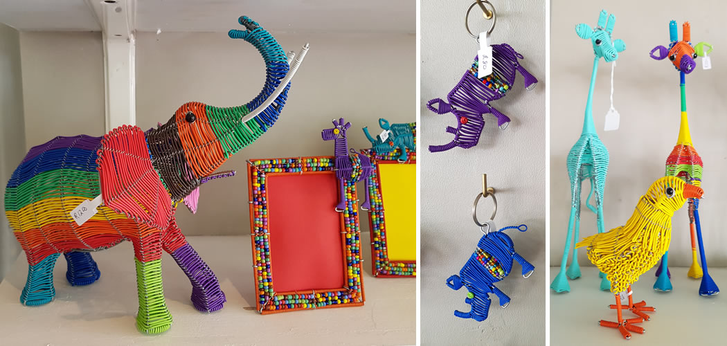 Tavengwa Dahwa uses colourful telephone wire to make a variety of animals and functional decorative items, from keyrings, paper clips and fridge magnets to chicken baskets and protea candle-holders. Then there’s a bright range of birds, from peacocks, to pelicans, flamingos and cranes, and African animals, from ostrich to elephant and rhino. Meticulously crafted and full of life they are selling as fast as he can make them!